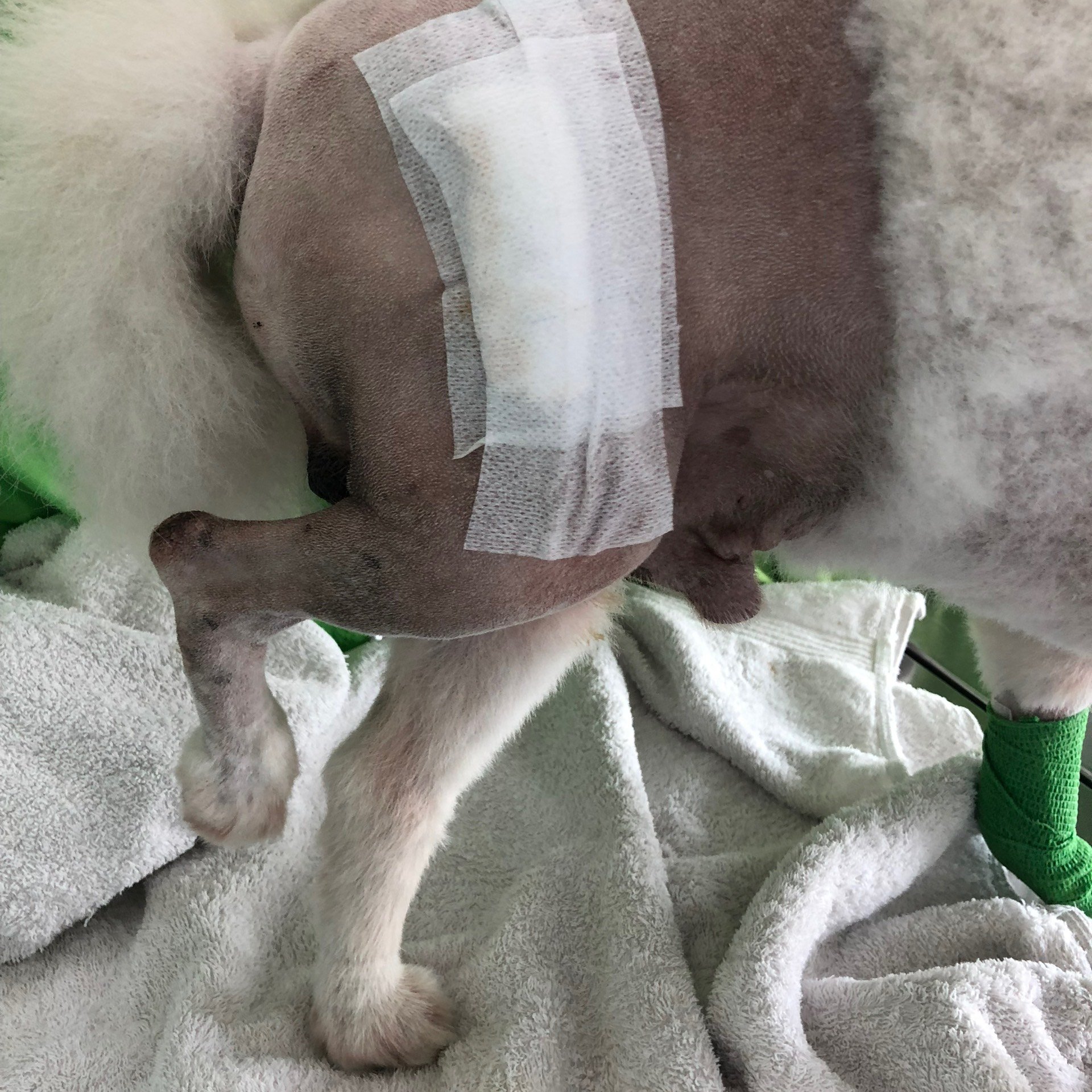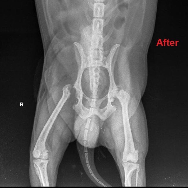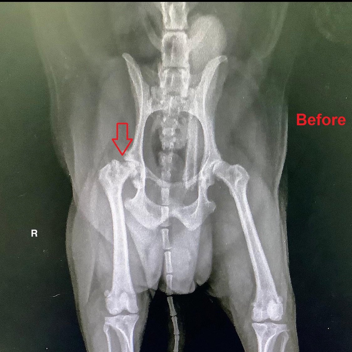 น้องโมจิได้รับการผ่าตัดโดยสัตวแพทย์ผู้เชี่ยวชาญด้านโรคกระดูกและข้อ โดยใช้เทคนิค Femeral head and neck excision หรือ FHNE ซึ่งเป็นการตัดเอาส่วนหัวและคอของกระดูกขาหลังส่วนต้นออกเพื่อลดการเสียดสีของหัวกระดูกกับเบ้ากระดูกเชิงกราน หลังจากนี้ร่างกายจะสร้างเนื้อเยื่อพังผืดเข้ามายึดเป็นข้อเทียมทดแทนส่วนที่ตัดออกไป การผ่าตัดเป็นไปได้ด้วยดี น้องโมจิฟื้นตัวไว และอยู่ดูแลภายหลังผ่าตัดที่โรงพยาบาลสัตว์ไอเว็ทจนตัดไหม ตอนนี้น้องโมจิเริ่มลงน้ำหนักที่ขาหลังขวาได้แล้ว แต่ยังคงต้องเข้าหน่วยกายภาพบำบัดเพื่อฟื้นฟูกล้ามเนื้อที่ฝ่อลีบให้กลับมาแข็งแรง และช่วยให้สามารถเดินได้ใกล้เคียงปกติที่สุด